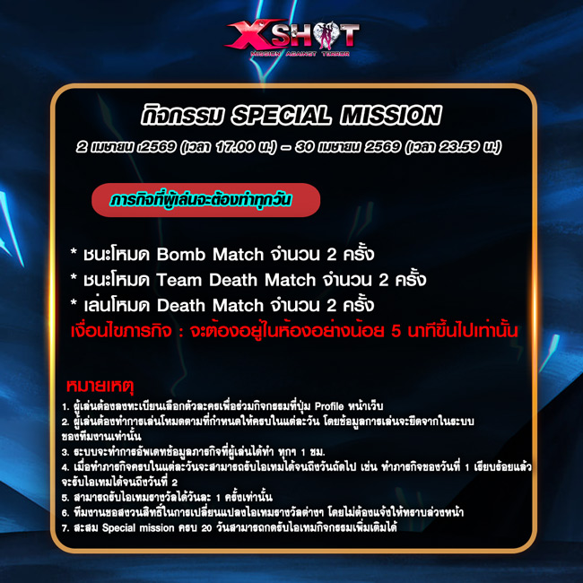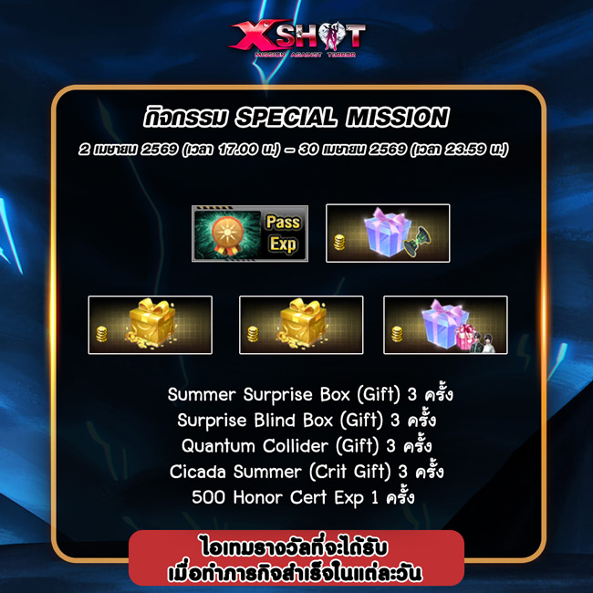 6.   ผู้เล่นสามารถกดรับไอเทมรางวัลภารกิจได้ถึงวันที่1 พฤษภาคม 2569เวลา 23.59 น.