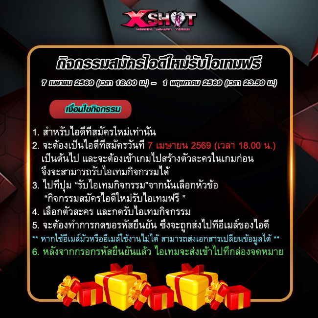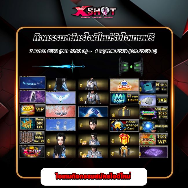 ทีมงาน Xshot มีกิจกรรมดีๆ มาต้อนรับผู้เล่นใหม่กันอีกแล้ว กับกิจกรรม สมัครไอดีใหม่รับไอเทมฟรี เพียงสมัครไอดีใหม่และเข้าเกมตามเงื่อนไข ก็สามารถรับ ไอเทมสุดพิเศษจากทีมงานแบบยกชุด ไปใช้งานกันได้ทันที ฟรี !!
