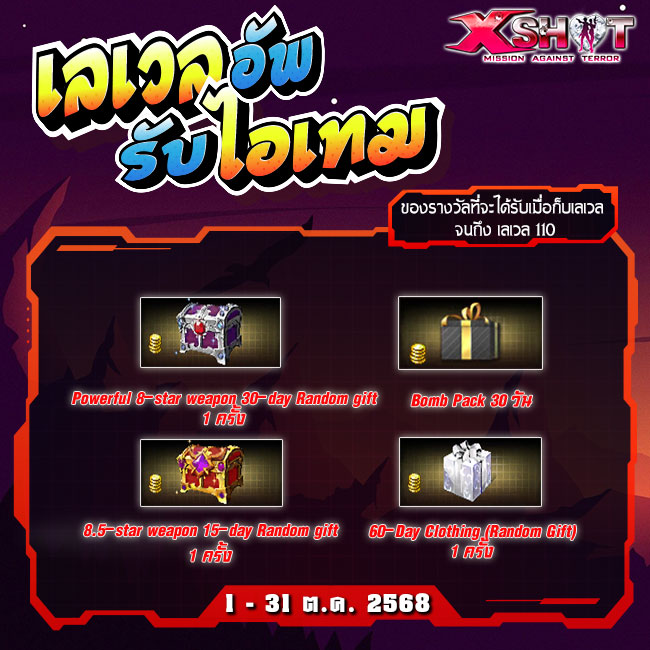 สวัสดีครับ สัปดาห์นี้ทางทีมงาน Xshot ก็มีกิจกรรมดีๆ มาให้ผู้เล่น นั่นก็คือกิจกรรมเลเวลอัพรับไอเทม งานนี้กิจกรรมเพื่อคนขยันเวลโดยเฉพาะ ของรางวัลโหดๆดีๆแบบนี้ใครเห็นก็คงขยันกันอัพเวลแน่ๆ กิจกรรมนี้แนะนำว่าห้ามพลาดเด็ดขาด เดี๋ยวจะหาว่าไม่เตือนนะครับ
