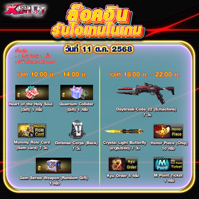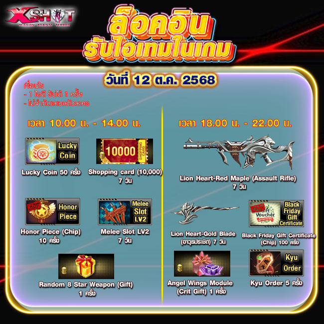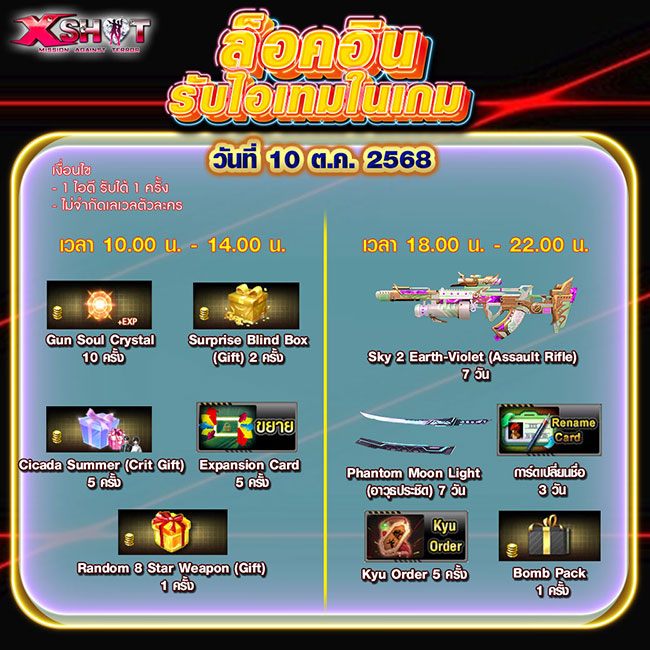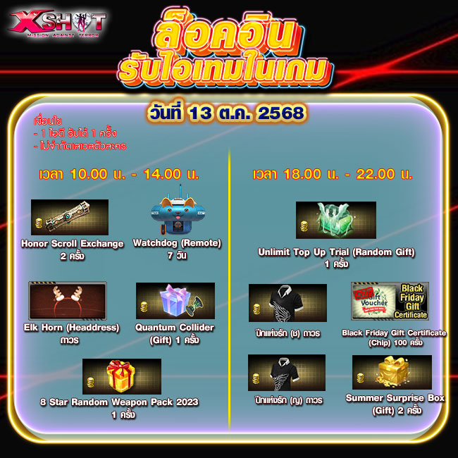 ทีมงาน XSHOT ขอเชิญทุกท่านร่วมสนุกกับกิจกรรมสุดพิเศษ"ล็อกอินรับไอเทมฟรีวันหยุดสุดสัปดาห์" ที่จะทำให้วันหยุดของคุณสนุกยิ่งขึ้น!